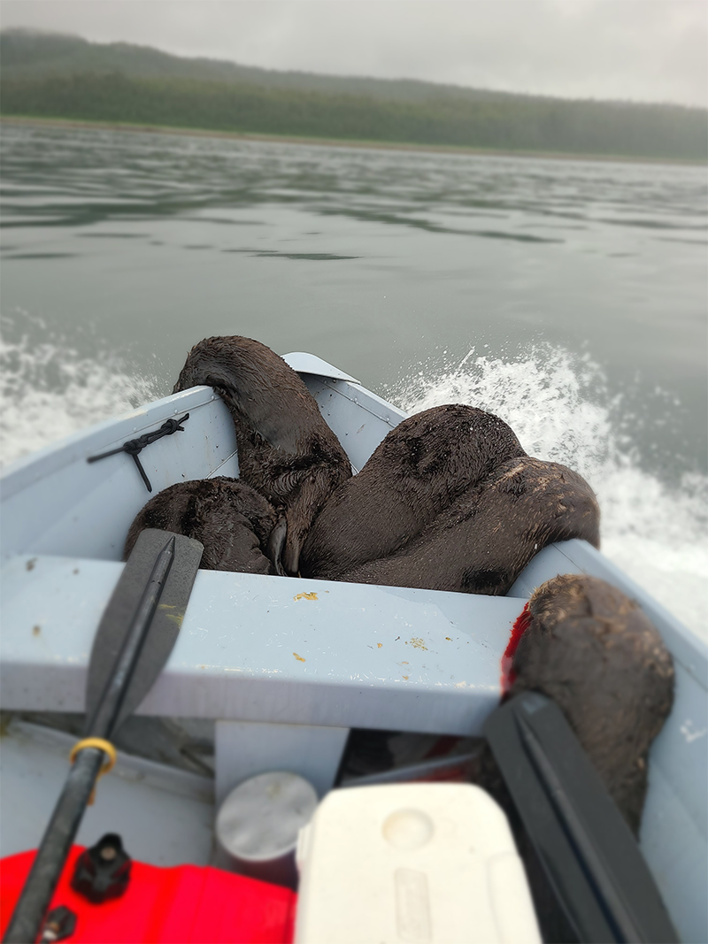 The hunt starts early in the morning with sharp knives, bullets, and ice to cool the skins. A 12 foot open skiff really starts to feel small out in these big waters, so careful planning is always necessary. Even with the best precautions, nature always finds something to throw at you in this country. On a rare good day, it is possible to take an otter from the boat, but they are very intelligent and don’t wait around to be brought onboard.